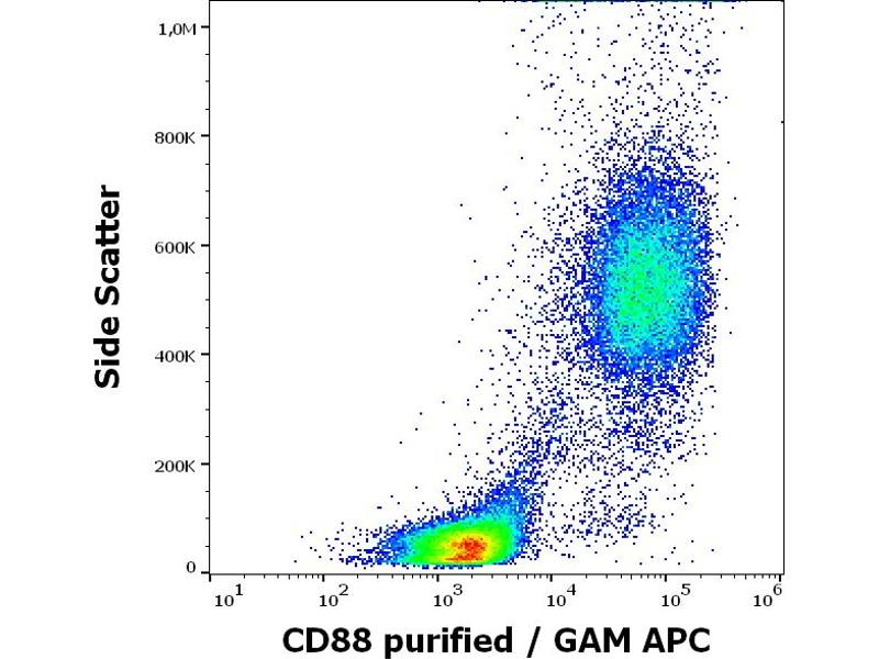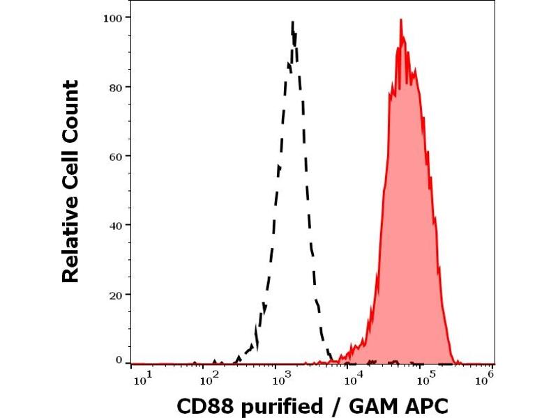 Complement C5a receptor 1,CD88 / C5aR is a G protein-coupled seven membrane-spanning protein serving as a receptor for C5a component of the complement cascade, and is expressed mainly by monocytes, macrophages, neutrophils, eosinophils, and mast cells, but also e.g. by hepatocytes, glial cells, vascular endothelial cells, or cardiomyocytes. The binding of C5a to CD88 is associated with inflammatory response, including superoxide anion production, chemotaxis, and increased production of acute phase proteins. Expression of CD88 on synovial mast cells and their C5a-mediated degranulation plays a role in pathogenesis of rheumatoid arthritis.,C5A, C5R1, C5AR1