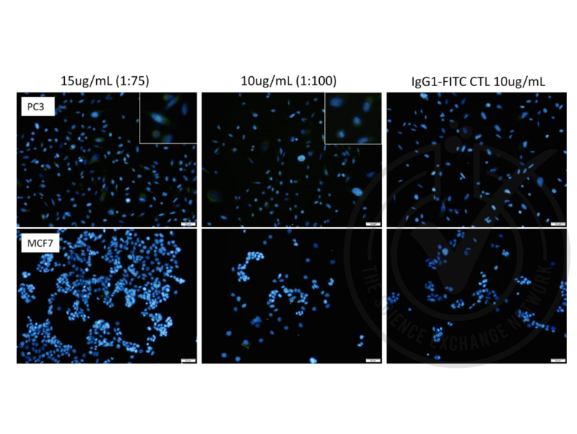 Right panel: Micrograph image of reagent isotype control FITC-conjugated mouse IgG1 antibody on PC3 Nestin-positive prostate adenocarcinoma cells (top) and MCF7 breast adenocarcinoma cells (bottom).