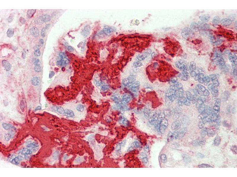 Immunohistochemistry: Paraffin embedded Human Placenta and Kidney. Recommended concentration: 5 μg/mL.