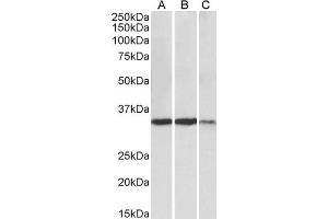 Western Blot: Approx 35 kDa band observed in Human Heart, Skeletal Muscle and Kidney lysates (calculated MW of 36.7 kDa according to NP_005557.1). Recommended concentration: 0.3-1 μg/mL.
