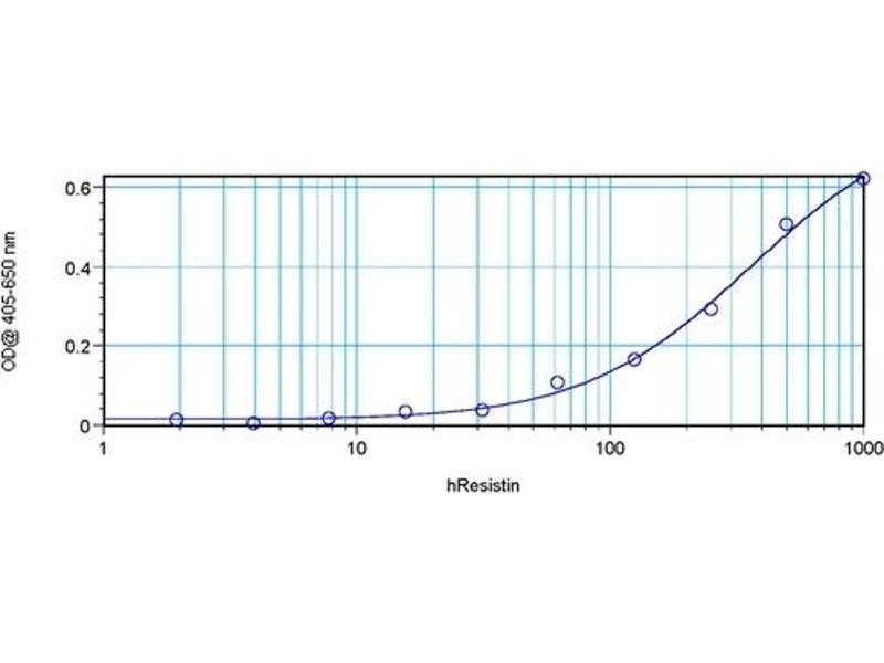 ELISA: In a sandwich ELISA (assuming 100μL/well), a concentration of 4.0-8.0 μg/mL of thisantibody will detect at least 200 pg/mL of recombinant human Resistin when used withBiotin anti-human Resistin antibody (cat. PP1214B) as the detection antibody at aconcentration of at least 0.5-1.0 μg/mL. Western Blot: To detect Human Resistin by Western Blot analysis this antibody can beused at a concentration of 0.20-0.40 μg/mL. Used in conjunction with compatiblesecondary reagents the detection limit for recombinant hResistin is 0.20-0.40 ng/lane,under non-reducing conditions. Other applications not tested. Optimal dilutions are dependent on conditions and should be determined by the user.