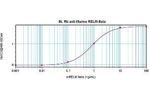ELISA: Direct: To detect mRELMβ (using 100 μL/well antibody solution) a concentration of0.25 - 1.0 μg/mL of this antibody is required. In conjunction with compatible secondaryreagents, it allows the detection of at least 0.2 - 0.4 ng/well of recombinant mRELMβ. Sandwich: To detect mRELMβ (using 100 μL/well antibody solution) a concentration of0.25 - 1.0 μg/mL of this antibody is required. In conjunction with Polyclonal Anti-MurineRELMβ as a capture antibody, it allows the detection of at least 0.2 - 0.4 ng/well ofrecombinant mRELMβ. Western Blot: To detect mRELMβ by Western Blot analysis this antibody can be used at aconcentration of 0.1 - 0.2 μg/mL. Used in conjunction with compatible secondary reagentsthe detection limit for recombinant mRELMβ is 1.5 - 3.0 ng/lane, under either reducing ornon-reducing conditions. Other applications not tested. Optimal dilutions are dependent on conditions and should be determined by the user.
