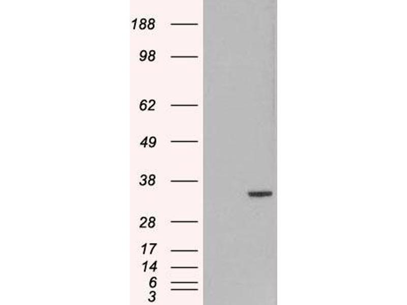 Western Blot: In transfected HEK293 transiently expressing ORC6L a band of approx. 33 kDa is observed. This band is not observed in the non-transfected HEK293. The calculated molecular size is 28.1 kDa according to NP_055136.1. Recommended concentration, 1