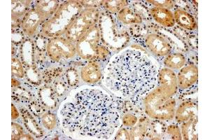 Immunohistochemistry: In paraffin embedded Human Kidney shows nuclear staining, stronger in DCT compared to PCT. Recommended concentration, 4-6 μg/mL.