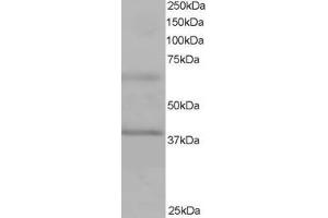 Western Blot: Approx 38 kDa band observed in Human Heart lysates, and approx. 50 kDa in preliminary testing of MCF7 cell lysate (calculated MW of 37.6 kDa according to NP_115937.1 and 54 kDa according to , NP_742024.1). An additional band was also consisten