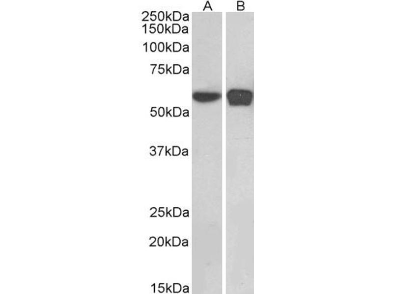 Western Blot: Approx 60 kDa band observed in nuclear lysates of cell lines HEK293 and NIH3T3 (calculated MW of 57.2 kDa according to Human NP_002660.1 and 56.9 kDa according to Mouse NP_058064.2). Recommended concentration: 0.1-0.3 μg/mL. Primary incubation