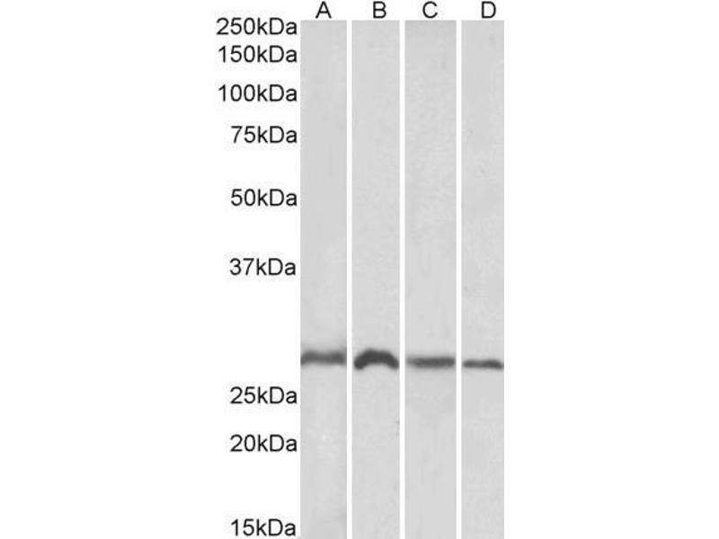 Western Blot: Approx. 37 kDa band observed in Human Liver lysates and approx. 30+37 kDa bands in Rat Liver lysates (calculated MW of 34.6 kDa according to Human NP_001006611.1 and 31.1 kDa according to Rat NP_543181.2 and 38.2 kDa according to Rat XP_03895336