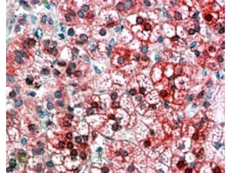 Immunohistochemistry: In paraffin embedded Human Adrenal Gland shows membranous and fibrous staniing in and around secretory cells of the zona fasciculata in the cortex. Recommended concentration, 3-5 μg/mL.