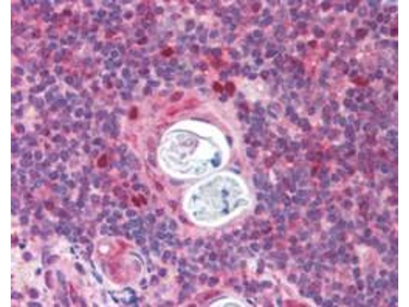 Immunohistochemistry: In paraffin embedded Human Thymic medula shows staining of select nuclei. Recommended concentration: 2.5 μg/mL.
