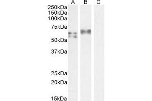 Western Blot: Approx 55+60 kDa bands observed in Human Spleen lysates and approx 65 kDa in lysates of cell line A549 (calculated MW of 57.8 kDa according to NP_001092099.1 and 56.0 kDa according to NP_116032.1, NP_001092097.2). Recommended concentration: 0.3