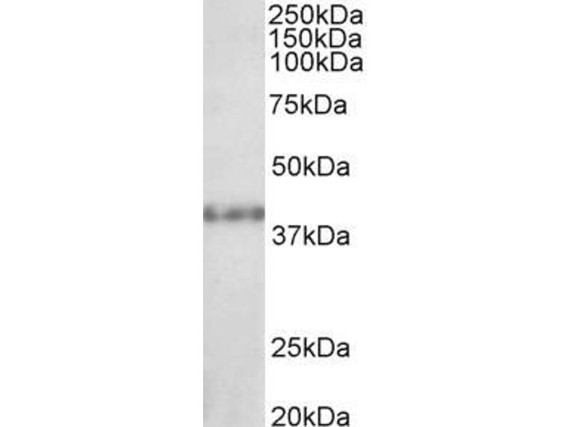 Western Blot: Approx 38 kDa band observed in Rat Kidney and Testis lysates (calculated MW of 39.9 kDa according to NP_078946.1). Recommended concentration: 1-3 μg/mL. Primary incubation was 1 hour. Preliminary testing was unsuccessful on Mouse, Human and Pi