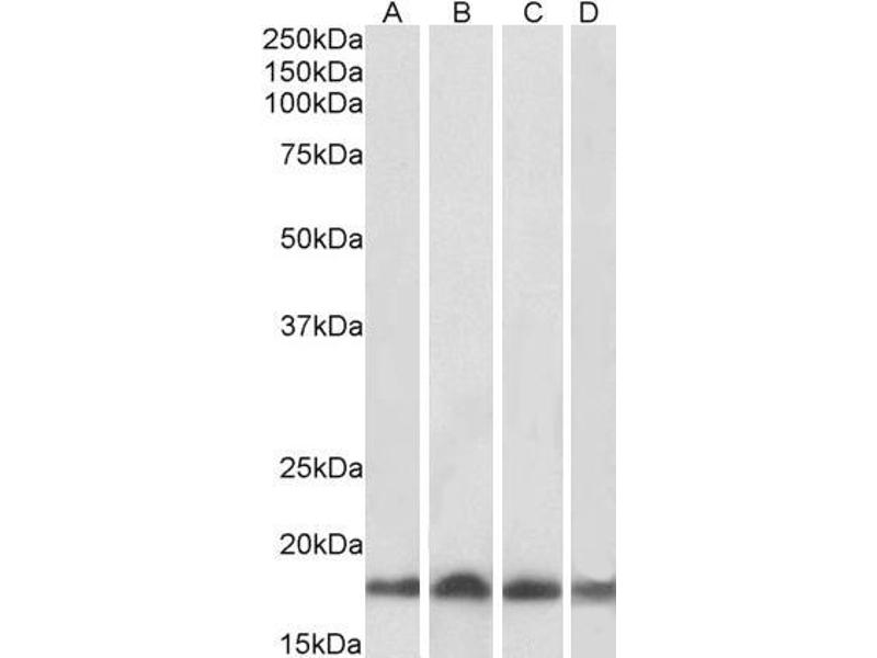 Western Blot: Approx 18 kDa band observed in lysates of cell lines HeLa HEK293, HepG2 and Jurkat and also in lysates of Human, Mouse and Rat Heart, Skeletal Muscle and Testis and of Pig Heart (calculated MW of 17.9 kDa according to Human NP_003338.1 and Mo