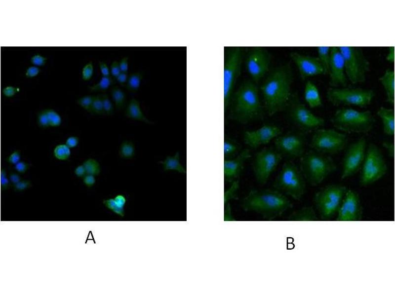 Immunofluorescence: Strong expression of the protein seen in the cytoplasm. Dividing cells appear to show enhanced expression. Recommended concentration: 5μg/ml.