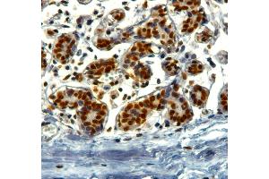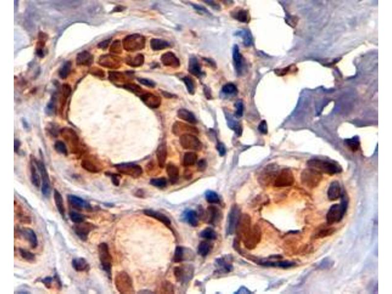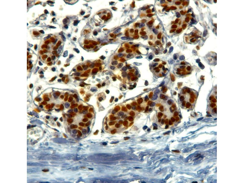 Immunohistochemistry: In paraffin embedded Human Breast shows nuclear staining in epithelial duct cells. Recommended concentration: 2-4 μg/mL.