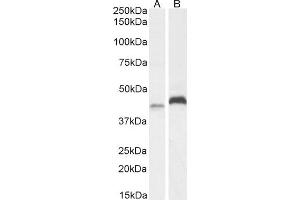 Western Blot: Approx. 42 kDa band observed in lysates of cell line A431 and in preliminary testing of Human Lung lysate, and approx. 45 kDa in lysates of cell line HeLa and in preliminary testing of U251 cell lysate (calculated MW of 42.8 kDa according to