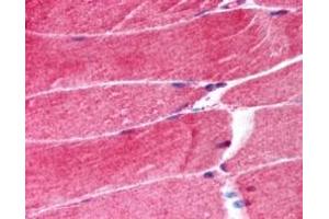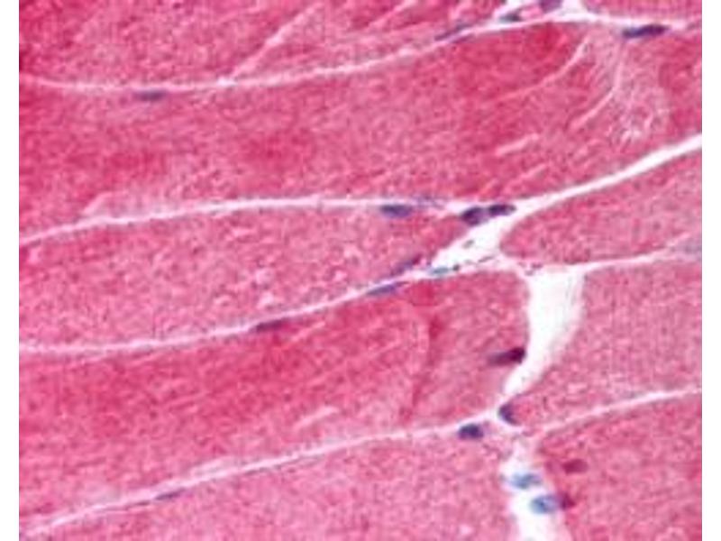 Immunohistochemistry: In paraffin embedded Human Skeletal Muscle shows strong staining in rare nuclei, and weak staining of muscle fibres in longitudinal section. Recommended concentration: 1.25 μg/mL.