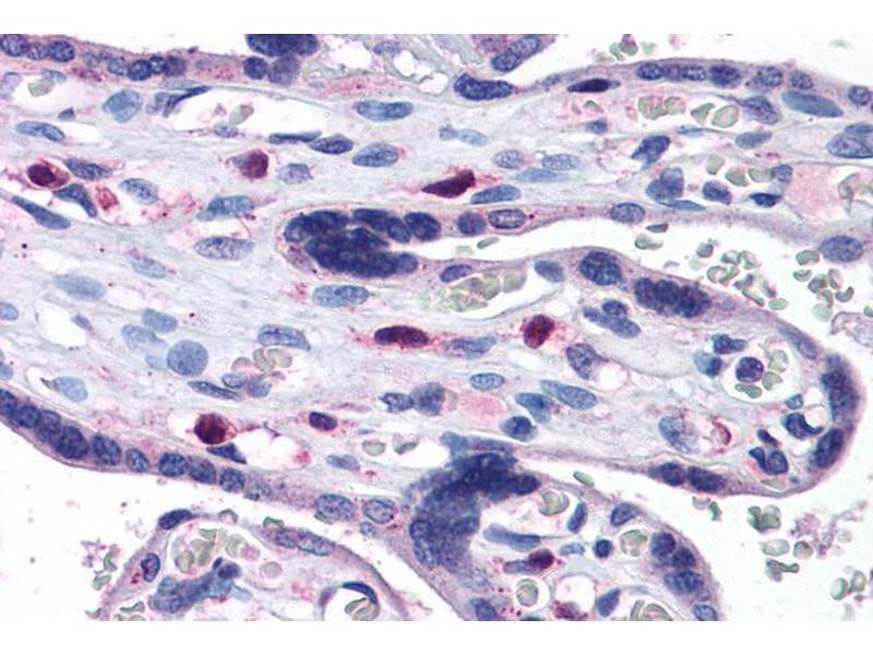 Immunohistochemistry: Paraffin embedded Human Placenta, Tonsil and Breast. Recommended concentration: 3.75 μg/mL.