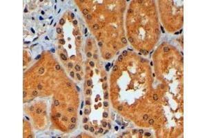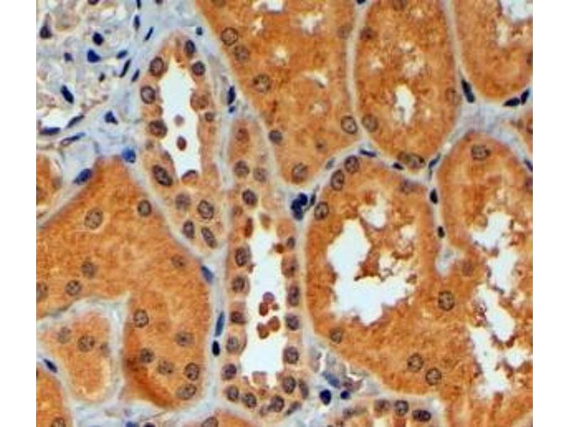 Immunohistochemistry: In paraffin embedded Human Kidney shows cytoplasm staining preferentially in PCT over DCT. Recommended concentration, 4-6 μg/mL.