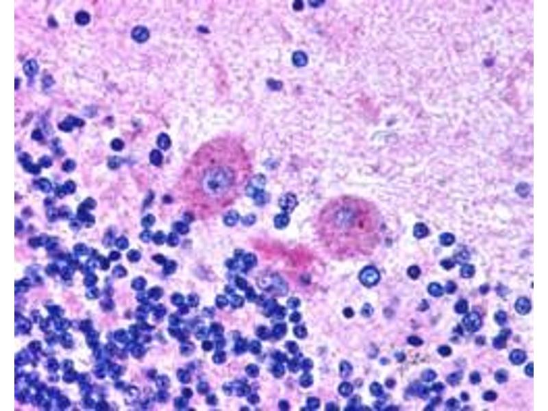 Immunohistochemistry: In paraffin embedded Human Brain shows cytoplasm staining of Purkinje cells in Cerebellum. Recommended concentration, 2.5 μg/mL.