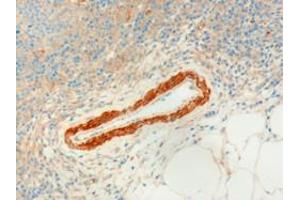 Immunohistochemistry: In paraffin embedded Human Lymph Node shows strongest staining in smooth muscle cells surrounding a vessel. Data obtained from a previous batch (different goat). Recommended concentration, 3 μg/mL.