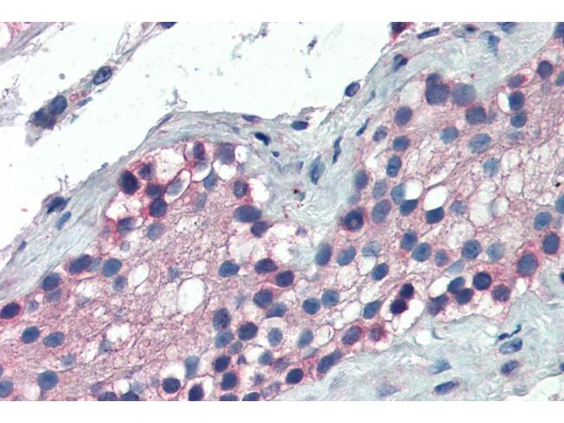 Western Blot: Preliminary experiments gave an approx 70 kDa band in Human Thymus and Thyroid Gland lysates after 0.3 μg/mL antibody staining. Please note that currently we cannot find an explanation in the literature for the band we observe given the calcu