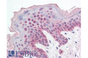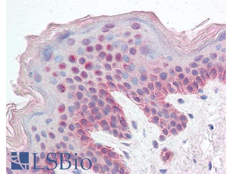 Immunohistochemistry: Paraffin embedded Human Skin. Recommended concentration: 5 μg/mL.