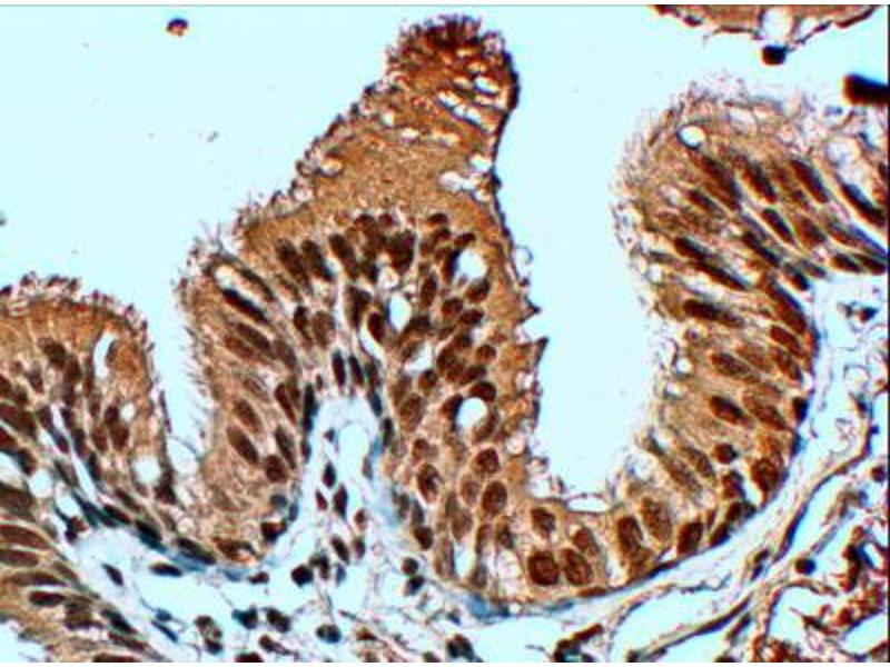 Immunohistochemistry: In paraffin embedded Human Lung shows staining of epithelial cells in the bronchioles and alveoli. Recommended concentration: 4-6 μg/mL.