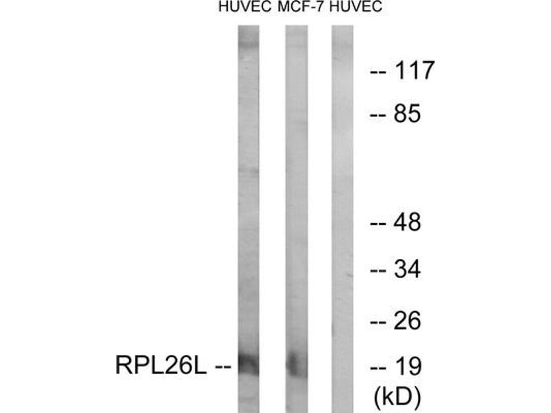 - The antiserum was produced against synthesized peptide derived from C-terminal of human RPL26L.