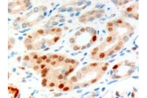 Immunohistochemistry: In paraffin embedded Human Kidney shows staining of nuclei in some cells of renal tubules. Recommended concentration: 3-10 μg/mL.