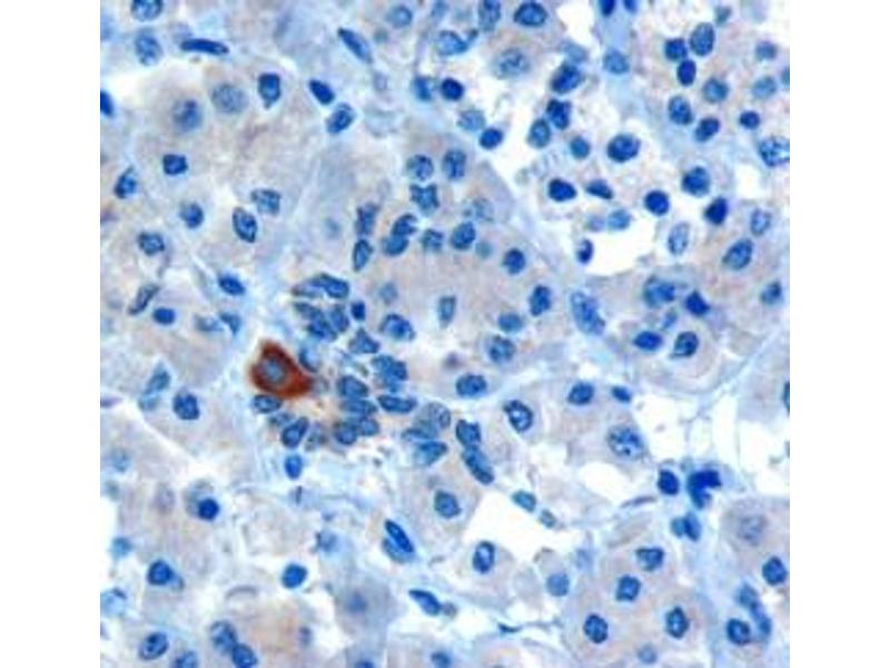 Immunohistochemistry: In paraffin embedded Human Pancreas, shows strong cytoplasmic staining in rare cells of intralobular ducts. Recommended concentration: 10 μg/mL. Also tested in paraffin embedded Human Heart where it shows speckled staining on myocar