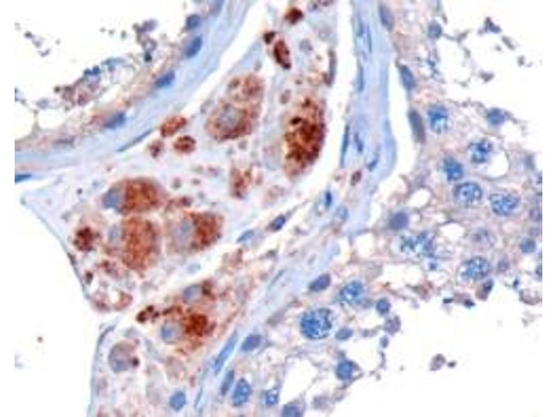 Immunohistochemistry: In paraffin embedded Human Testis shows granular cytoplasmic staining of Leydig cells. Recommended concentration: 10 μg/mL.