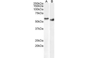 Western Blot: Approx 55 kDa band observed in Human Breast cancer and in Mouse and Pig Testis lysates, and approx. 58 kDa in nuclear lysates of cell line HEK293 (calculated MW of 58.1 kDa according to Human NP_543026.2, 59.5 kDa according to Mouse NP_899085.3