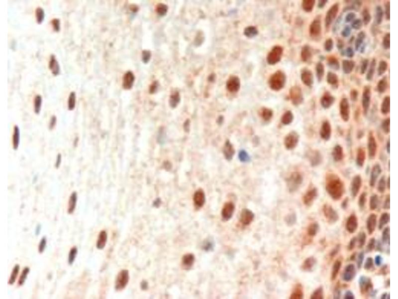 Immunohistochemistry: In paraffin embedded Human Esophagus expression of PAX3 is detected in squamous epithelium. Recommended concentration: 4.5 μg/mL.
