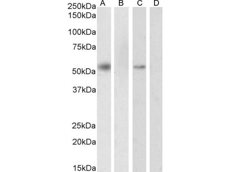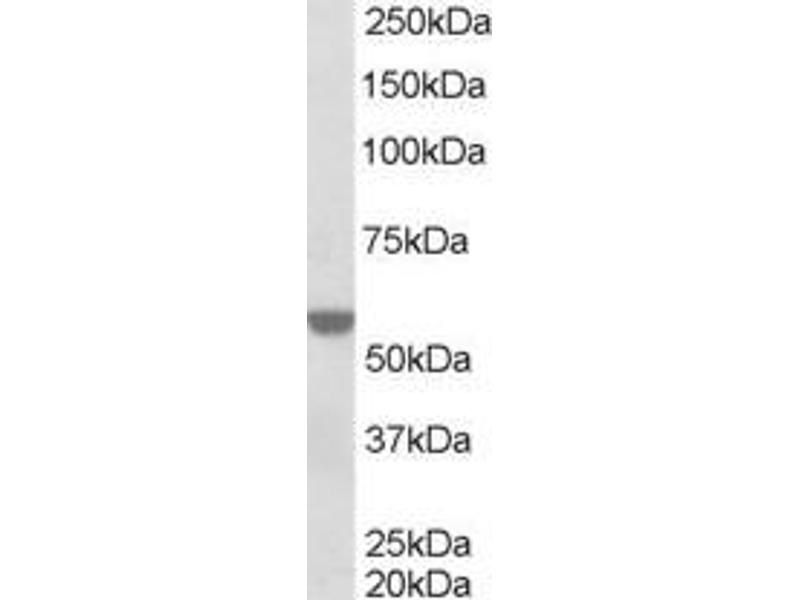 Western Blot: Approx 55-60 kDa band observed in nuclear lysates of cell lines HeLa and K562 (calculated MW of 50.8 kDa according to NP_002948.1). This molecular weight is routinely observed by other sources and was successfully blocked by incubation with