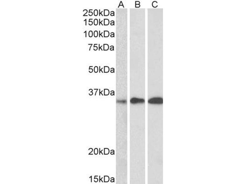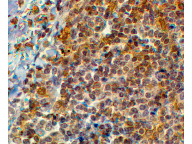 Western Blot: Approx 30 kDa band observed in Human Thymus, Human Lymph node and Human Tonsil lysates (calculated MW of 26.7 kDa according to NP_077305.2). Recommended concentration: 0.5-1.5 μg/mL. Primary incubation was 1 hour.