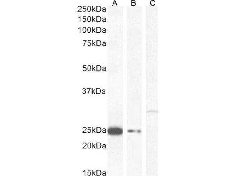 Western Blot: Approx 25 kDa band observed in Human Liver and Ovary lysates and in MCF7 cell lysates, and approx. 25 kDa and 30 kDa in U251 cell lysate (calculated MW of 30.0 kDa according to NP_000745.1(MB COMT) and 24.5 kDa according to NP_009294.1 (S-COMT)