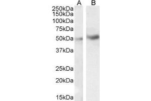 Western Blot: Approx 50 kDa band observed in lysates of cell line HeLa and approx 55 kDa in lysates of cell line Jurkat (calculated MW of 51.5 kDa according to NP_057207.1). This molecular weight is routinely observed by other sources. Recommended concentra