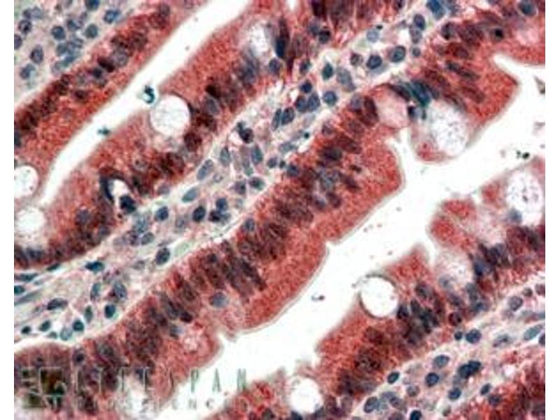 Immunohistochemistry: In paraffin embedded Human Small Intestine shows staining of the enterocytic cytoplasm. Recommended concentration: 4-6 μg/mL. Paraffin embedded Human Kidney. Recommended concentration: 4 μg/mL.