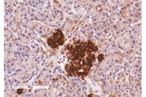 Immunohistochemistry: In paraffin embedded Human Pancreas shows strong staning in Islets of Langerhans. Recommended concentration, 2-4 μg/mL.