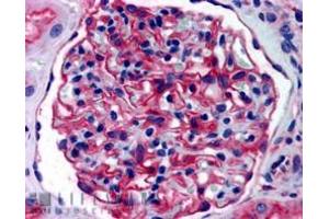 Immunohistochemistry: In paraffin embedded Human Kidney shows staining of basement membrane and the mesangium in the glomerulus. Recommended concentration: 3-5 μg/mL.