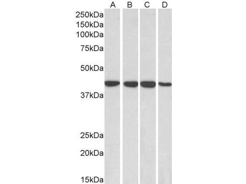 Western Blot: Approx 40 kDa band observed in lysates cell lines HepG2, HeLa, Jurkat and MCF7 (calculated MW of 41.0 kDa according to NP_003601.1). Recommended concentration: 0.1-0.3 μg/mL.