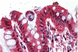 Immunohistochemistry: In paraffin embedded Human Placenta shows staining of trophoblast cytoplasm. Recommended concentration: 2-5 μg/mL. Paraffin embedded Human Colon. Recommended concentration: 2 μg/mL.