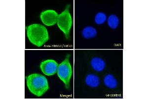 Immunofluorescence: Strong expression of the protein seen in the cytoplasm/ membranes of MCF7 cells. Recommended concentration: 10μg/ml.