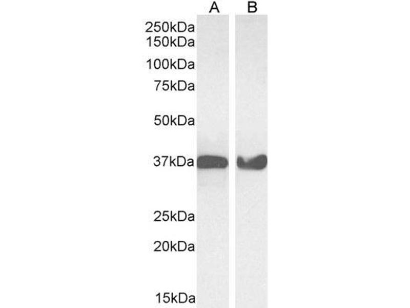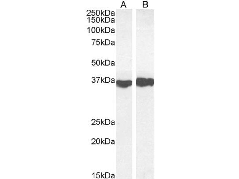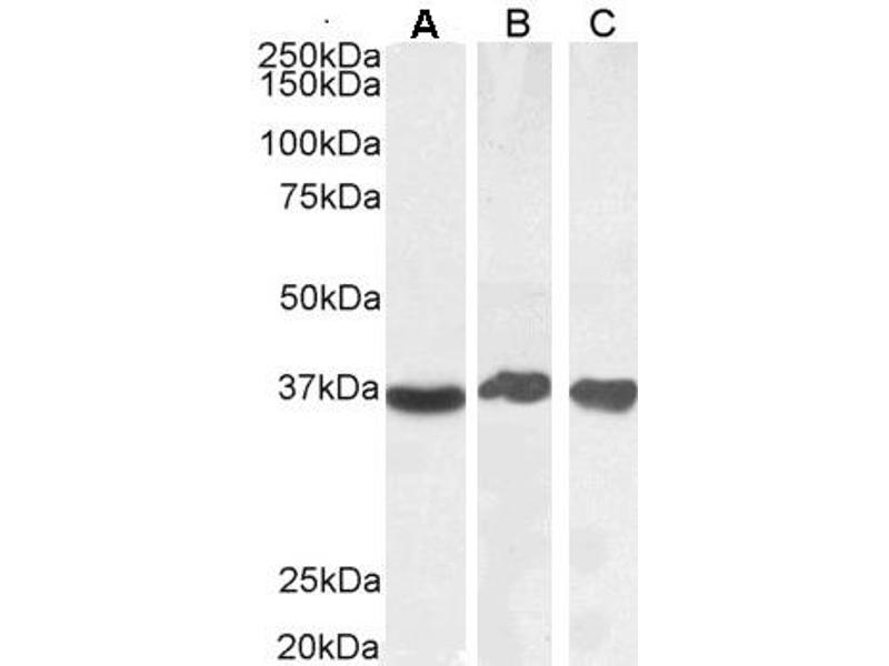 Western Blot: Approx 37 kDa band observed in Human Liver, Testis and Tonsil, and in Mouse Liver and Rat Heart lysates, and in cell lysates of HeLa and NIH3T3 (calculated MW of 36.1 kDa according to Human NP_002037.2, Mouse NP_032110.1, and Rat NP_058704.1