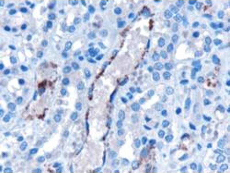 Immunohistochemistry: Paraffin embedded Human Kidney. Recommended concentration: 6-8 μg/mL.