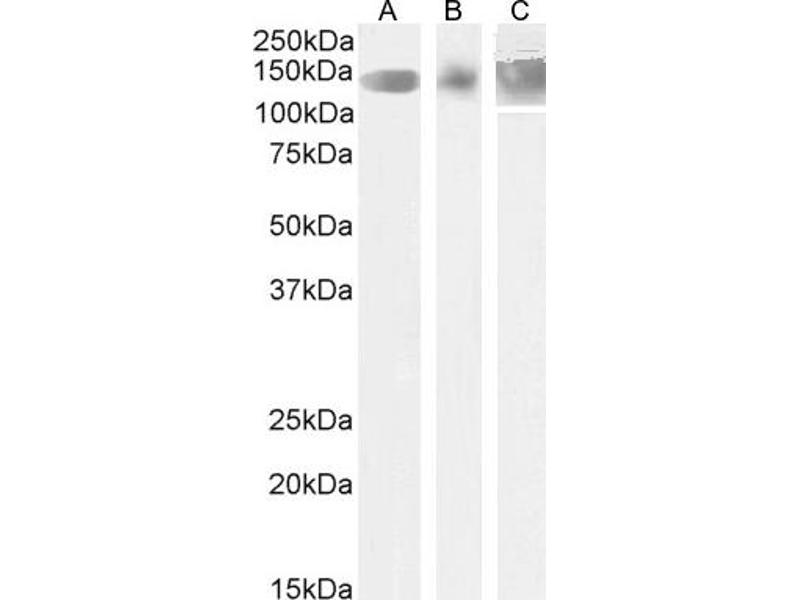 Western Blot: Approx 140-150 kDa band observed in Human Cerebellum, Mouse Foetal Brain and Rat Brain lysates (calculated MW of 132 kDa according to Human NP_002294.2 and 130.8 kDa according to Mouse NP_666258.2 and Rat NP_036728.1). This molecular weight is