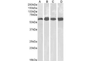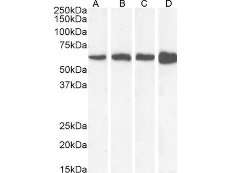 Western Blot: Approx 60 kDa band observed in Human and Mouse Kidney and Liver lysates (calculated MW of 59.8 kDa according to Human NP_001743.1 and Mouse NP_033934.2 ). Recommended concentration: 0.003-0.01 μg/mL. Primary incubation 1 hour at room temperatu