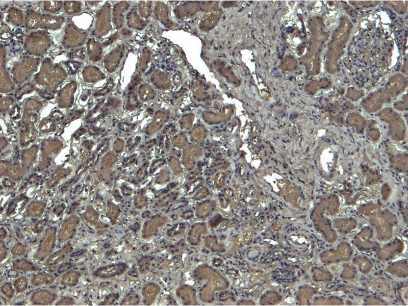 Immunohistochemistry: Paraffin embedded Human Kidney. Recommended concentration: 4-6 μg/mL.