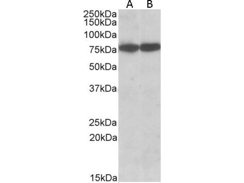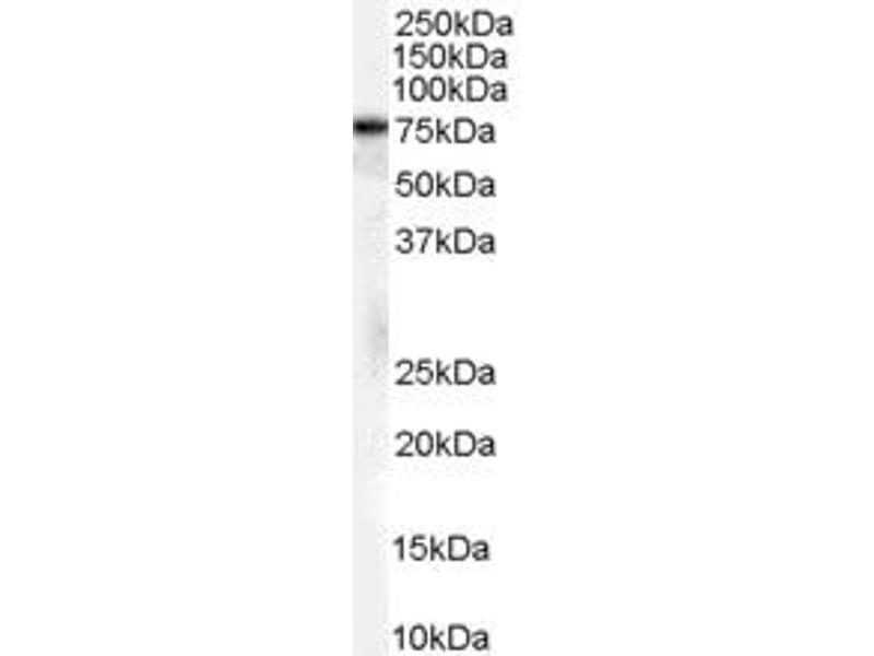 Western Blot: Approx 75 kDa band observed in lysates of cell lines HepG2 and NIH3T3 (calculated MW of 70.9 kDa according to Human NP_006588.1 and Mouse NP_112442.2). This molecular weight is routinely observed by other sources. Recommended concentration: