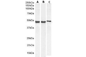 Western Blot: Approx 48 kDa band observed in Human Cerebellum and in Mouse Brain lysates and approx.. 50 kDa in Rat Brain lysates ,(calculated MW of 49.9 kDa according to, Human NP_002046.1, Mouse NP_034407.2 and Rat NP_058705.2). Recommended concentration: